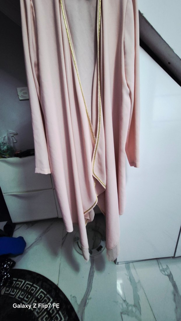 Uzun, bol kesim pembe kadın hırka kap ince askılı kollara ve desensiz sade tasarıma sahiptir. Paris normcore tarzını yansıtır.