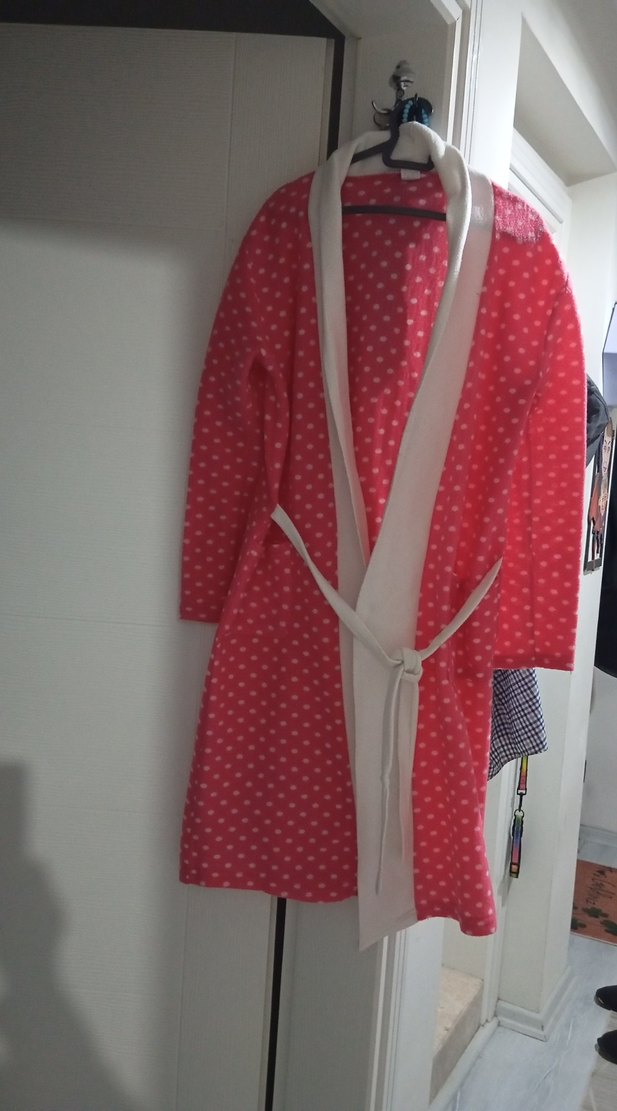 Uzun, pembe kadın sabahlık polar, bol kesim ve askılı kollara sahiptir. yakası ve kemeri ile çağdaş Paris tarzını yansıtır.