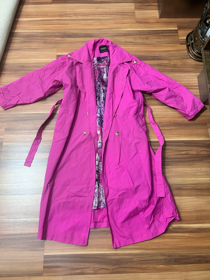 Sıfır hiç kullanılmadı Uzun, bol kesim pembe trençkot, kuşaklı bel ve kesik yaka detayıyla. Sentetik keten kumaş, uzun kollu ve renkli astarlı. Günlük sokak stili için uygun.