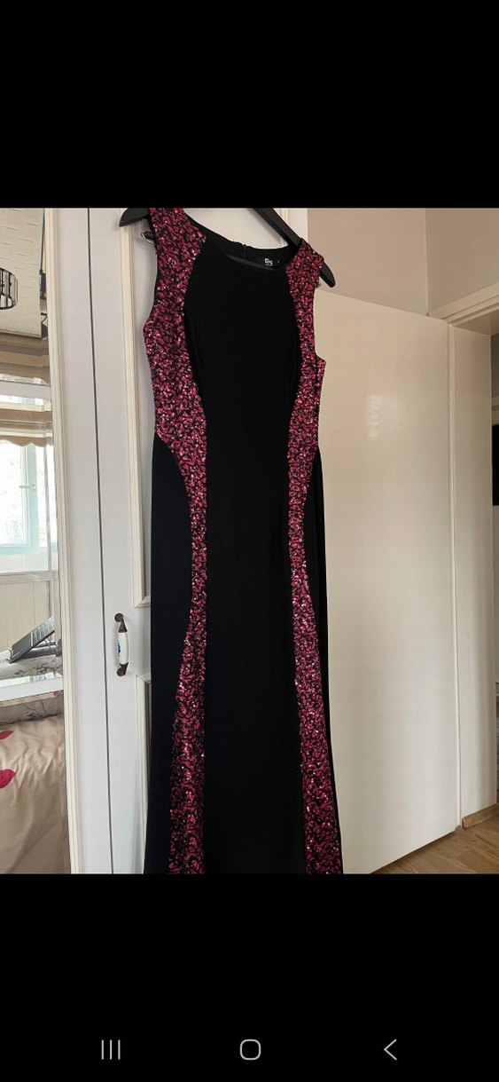 Kolsuz, v yakalı ve vücuda oturan bu uzun elbise, yanlarında pembe yılan desenli drapeli detaylara sahiptir, romantik akşamlar için uygundur kuzenimin nişanında bir kez giyildi.