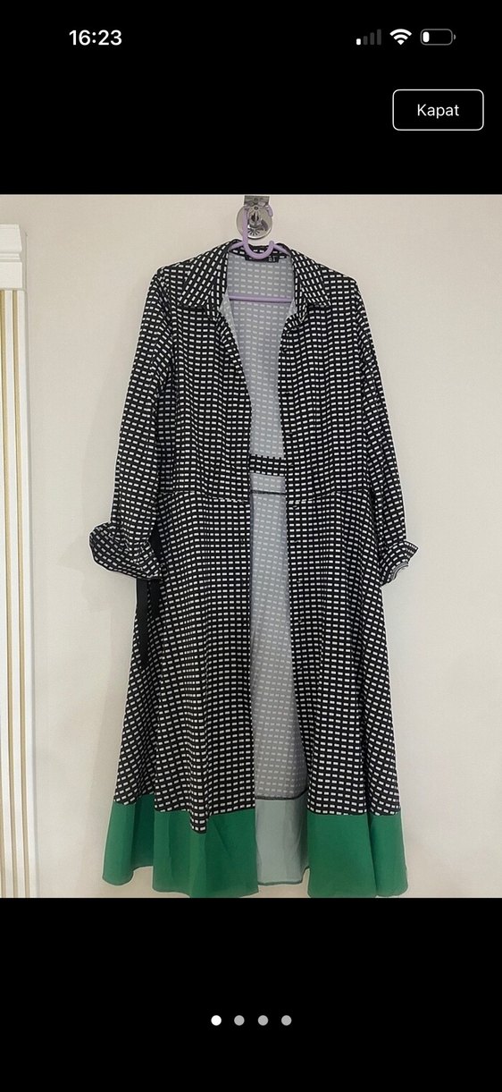 Uzun pileli kabanı, notalı yaka ve uzun kolludur. Siyah ve gri puantiyeli, yeşil etek ucu detaylı, sentetik kumaştan üretilmiştir. Günlük sokak stili için uygundur.