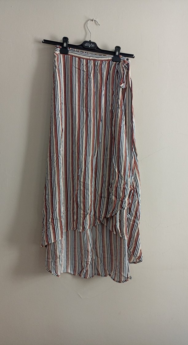 Uzun, pilili ve bol kesim olan bu etek, çok renkli çizgili desenli yumuşak sentetik kumaştan yapılmıştır. Günlük kullanıma uygun bohem tarzını yansıtır.