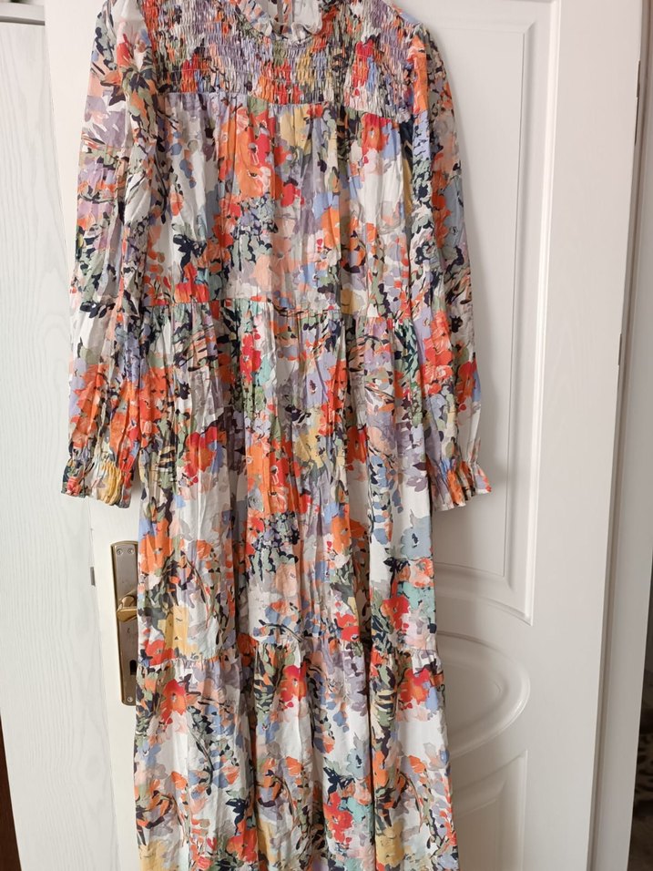 Uzun, bol kesim pilili elbise, yüksek yakalı ve uzun kolludur. Canlı çok renkli batik desenli, sentetik kumaştan yapılmıştır. Günlük kullanıma uygun bohem tarzda.