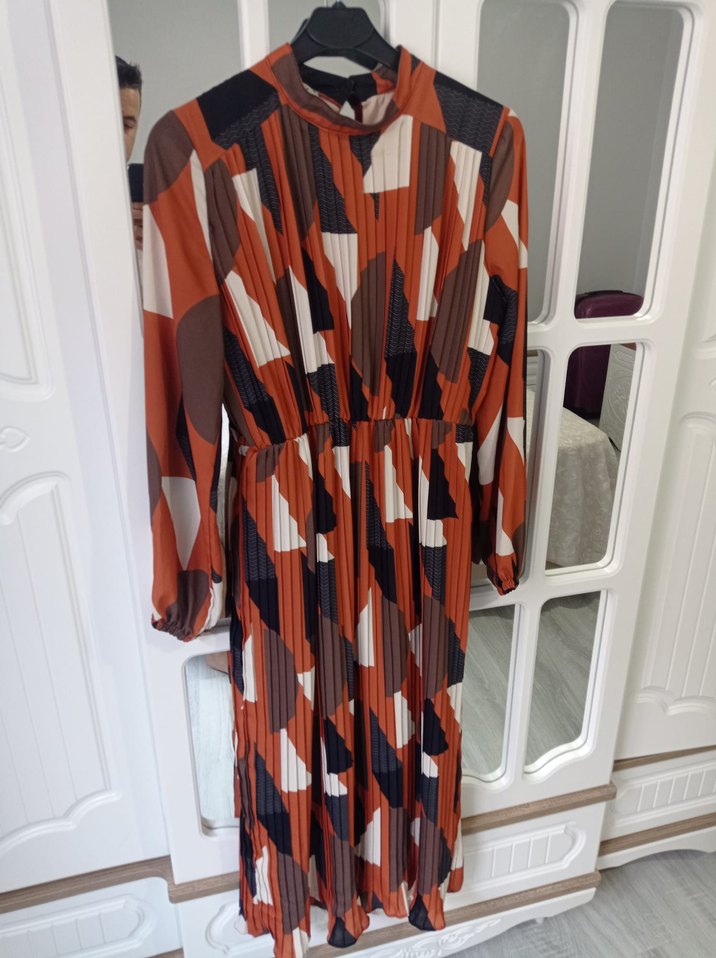 Uzun kollu, yüksek yakalı ve pilili tasarıma sahip bu elbise, bol kesim ve kahverengi desenli sentetik kumaftan yapılmıştır. Çağdaş ve şık bir görünüme sahiptir.