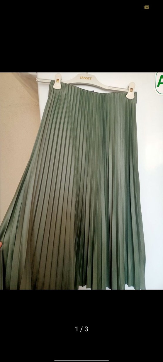 Uzun ve pilili, gevşek kesimli bu etek, mat yeşil-gri tonlarında yumuşak sentetik kumaştan yapılmıştır. Bohem tarz ve günlük kullanım için uygundur. JANSEY markası askıda görülmektedir.