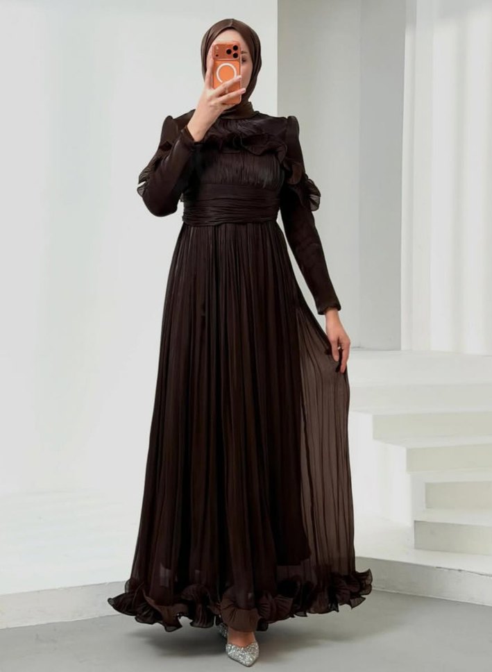 Uzun, bol kesim kahverengi elbise, pilili kumaş ve uzun kollu yüksek yakası ile klasik gotik şıklığını yansıtıyor. Düğünler için uygun.