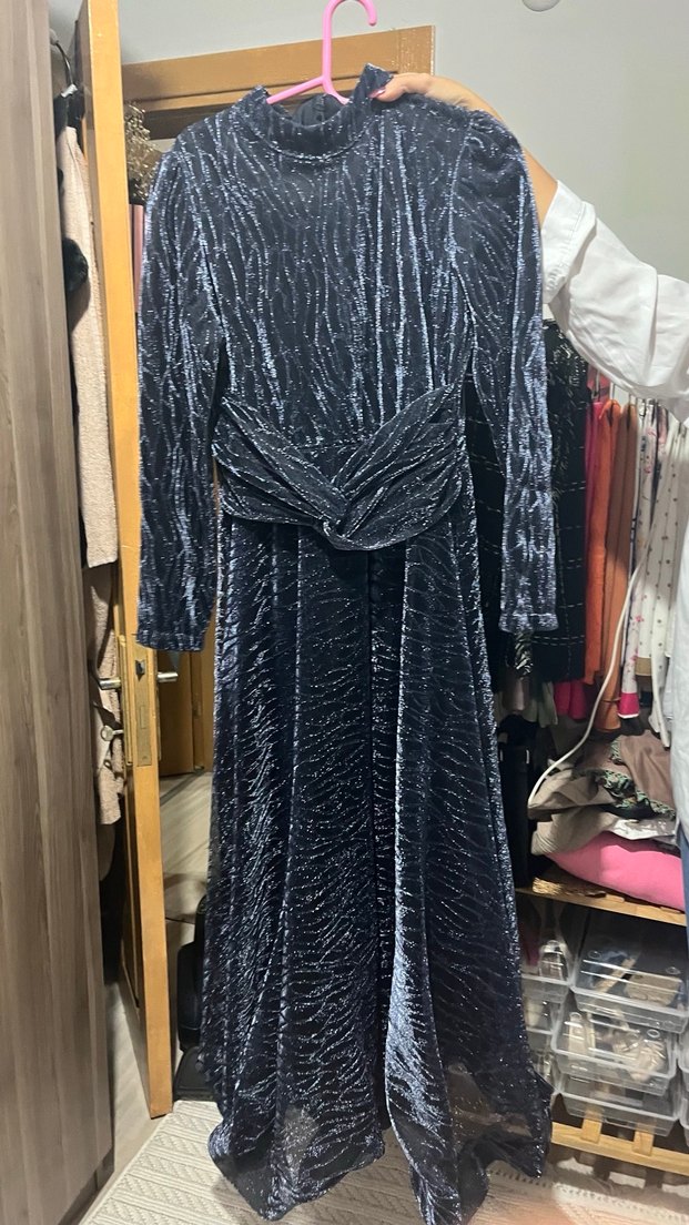 Uzun Pilili Lacivert Kadın Abiye Elbise