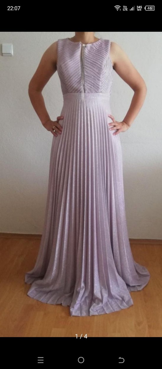 Yarım saat giyildi. 38 bedenden 36 bende göre daraltirildi. Pastel lila renkte, uzun ve pilili straplez abiye elbise. İnce askılı, düzenli kesim ve modern klasik tarzda, düğün gibi özel davetler için uygundur.