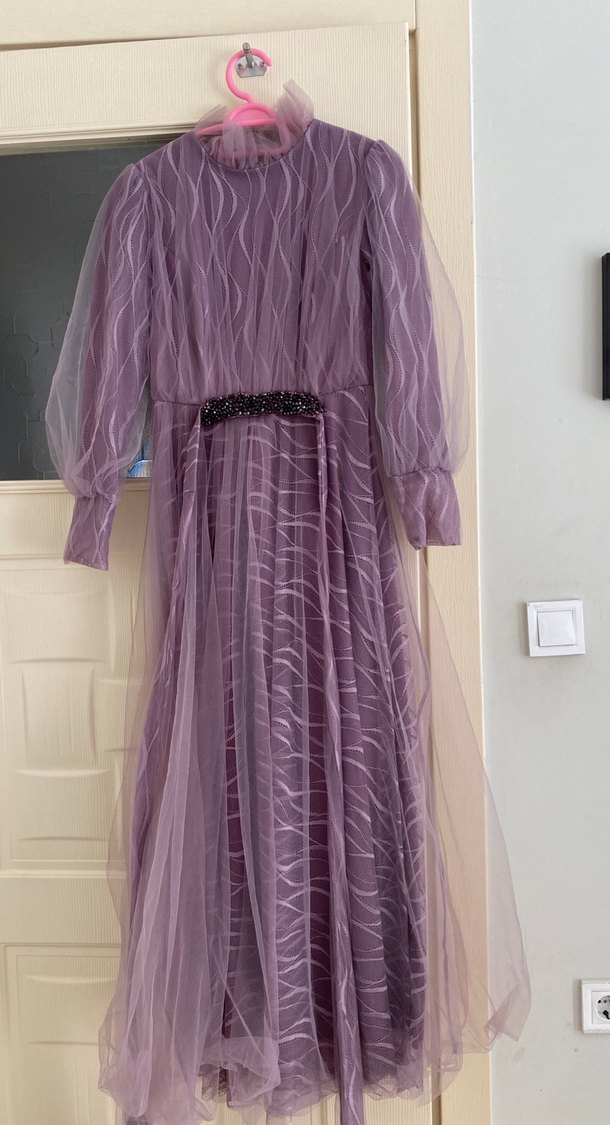Uzun, bol kesim elbise yüksek yakalı ve uzun kolludur. Pastel mor tie-dye desenli, pilili ve boncuklu bel detayına sahiptir, düğünler için uygundur.