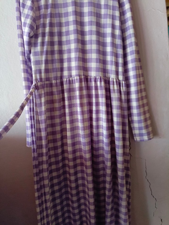 Uzun, bol kesim elbise, tekne yaka ve askılı kollara sahiptir. Yumuşak sentetik kumaştan yapılmış, pastel mor ekose deseni ve pilili tasarımıyla vintage sokak stili için uygundur.