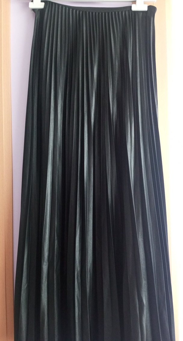 Uzun, siyah ve pilili olan bu etek, sentetik kumaştan üretilmiş olup normal kesimlidir. parti ortamları için uygundur. sık piledir.