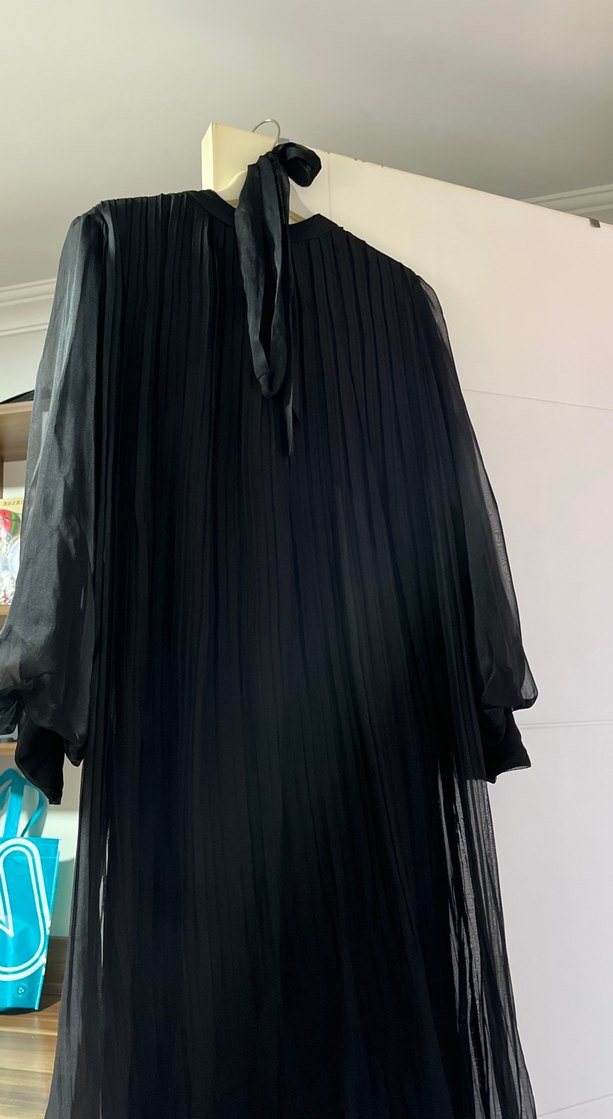 Uzun, siyah, pilili ve ipeksi kumaştan yapılmış bu elbise yüksek yakalı ve askılı uzun kolludur. Rahat kesimiyle gotik ofis stiline uygundur.