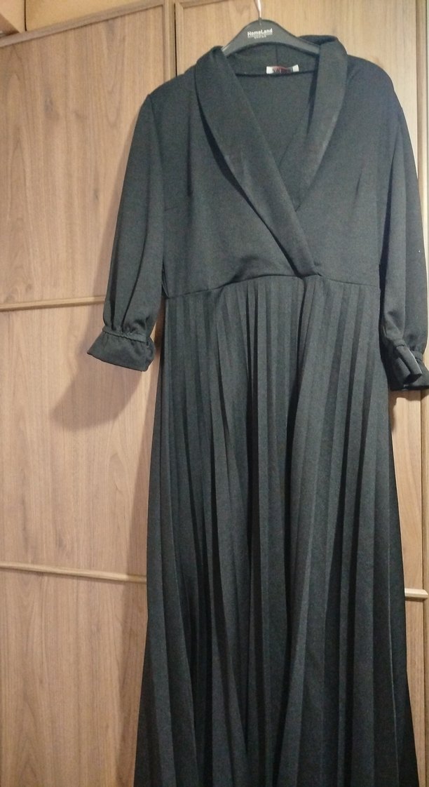 Notlu yaka ve pilili etek detaylı, uzun kollu siyah elbise. Rahat kesimi ve modern klasik tarzıyla ofis için uygun, sentetik kumaştan yapılmıştır. sadece bir kere giydim kemerini kaybettim tertemiz üründür