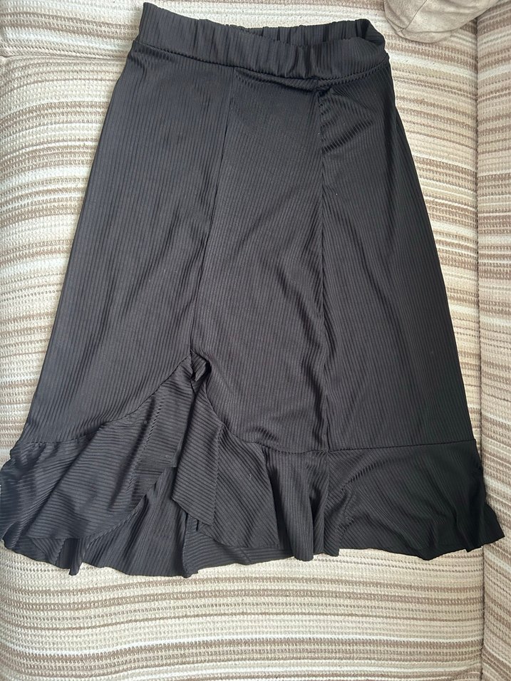 Düz siyah, uzun ve pilili bu kadın eteği, oturan kesimi ve volanlı etek ucu ile dikkat çeker. Pürüzsüz sentetik kumaştan üretilmiş, ofis için uygun goth tarzında bir parçadır.