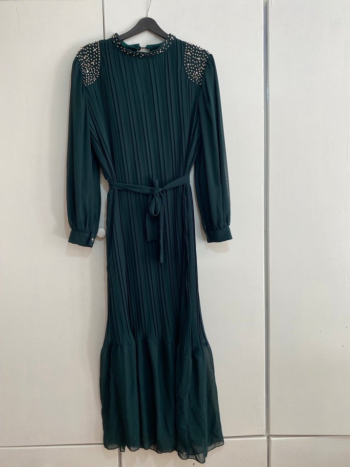 Uzun, piliseli ve kemerli yeşil elbise, yüksek yakalı ve dar kesimdir. Askılı kollarıyla ofis için uygundur. Özel günlerde de tercih edebilirisiniz.
