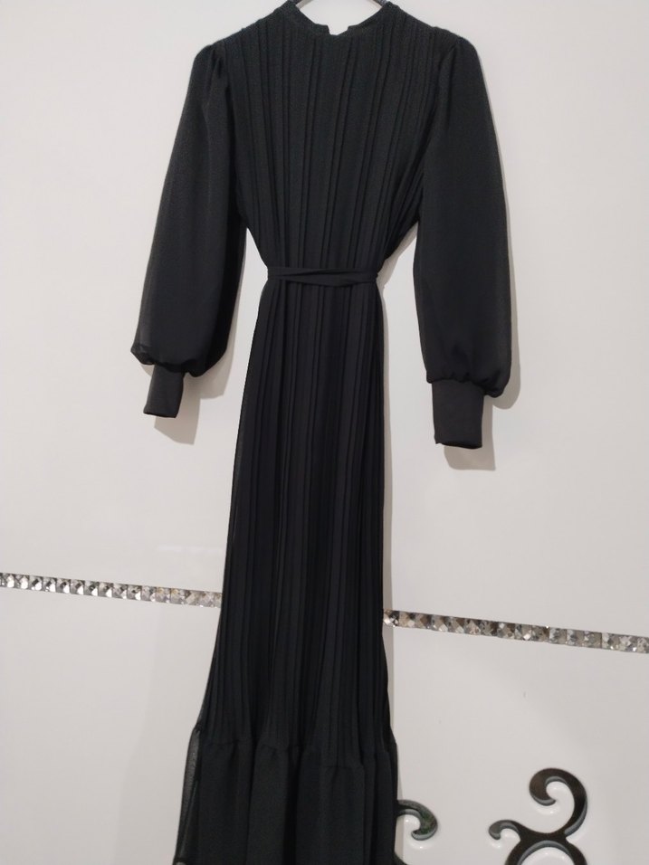 Siyah uzun piliseli, yüksek yakalı, manşetli uzun kollu, sentetik kumaştan klasik goth tarzı ofis elbisesi.