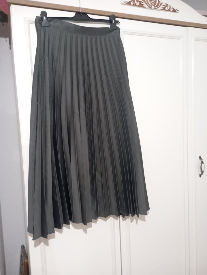 Uzun, bol kesim siyah etek, piliseli detaylara sahip ve yumuşak sentetik kumaştan üretilmiştir, ofis kullanımı için uygundur. 38,40 beden
