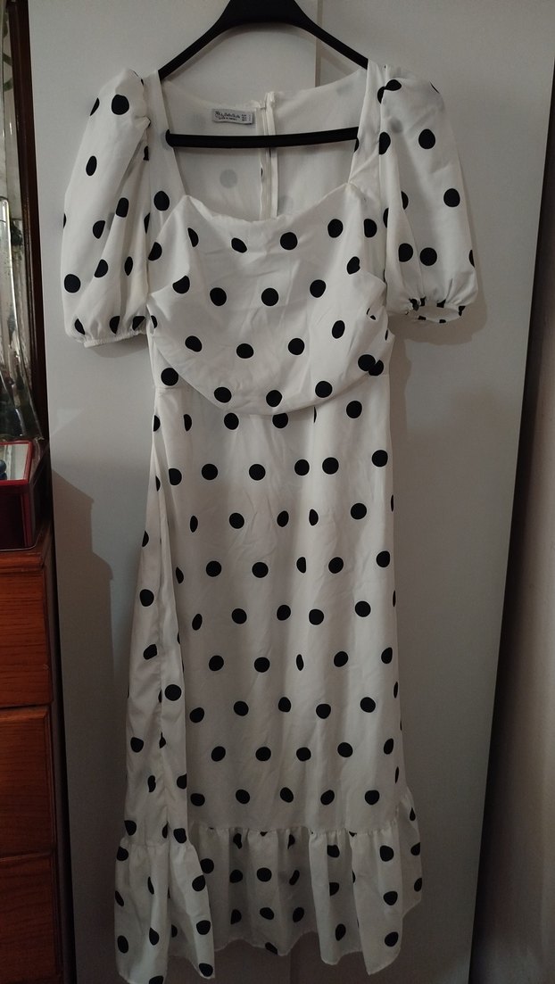 Bu uzun beyaz elbise siyah puantiyeler, tekne yaka, kısa balon kollu ve fırfır detaylara sahiptir. Sentetik kumaştan, bohem ve retro tarzını yansıtan, vücuda oturan bir kesime sahiptir. Günlük sokak stili için de uygundur.