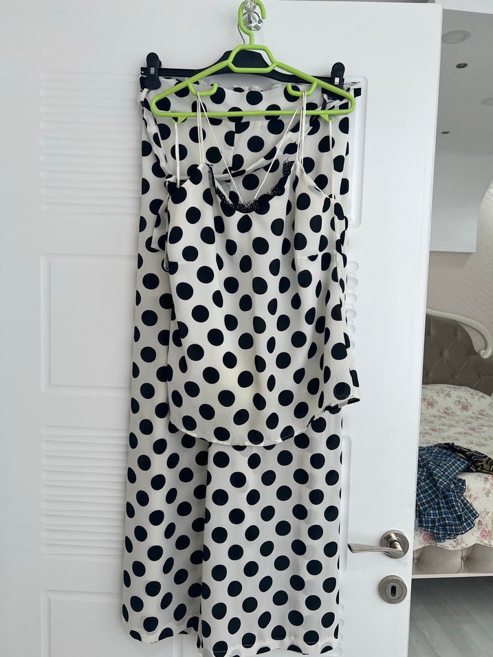 Uzun, bol kesim ve drapeli tasarıma sahip, beyaz ve puantiyeli üretilmiştir.