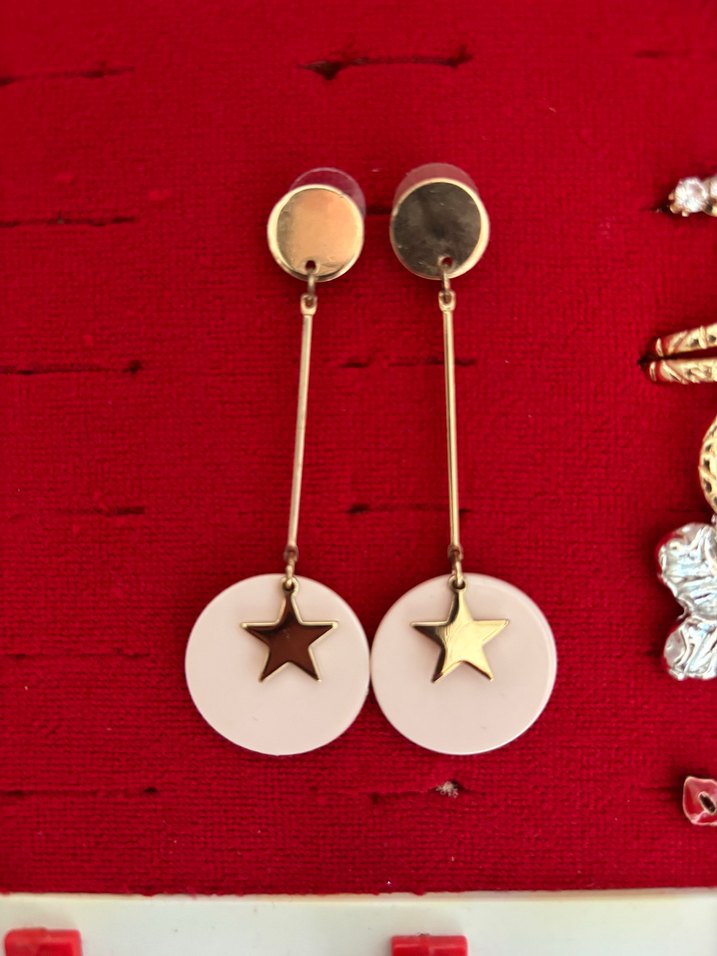 Altın yıldız detaylı, uzun beyaz püsküllü küpeler. Minimalist ve çağdaş tasarıma sahip, romantik akşamlar için uygun.✨
