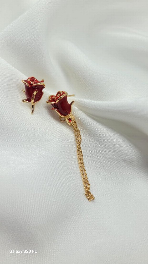 Kadın küpeleri, uzun altın püsküllü zincir ve kırmızı gül tasarımı ile bohem stil ve klasik zarafeti bir araya getirir.