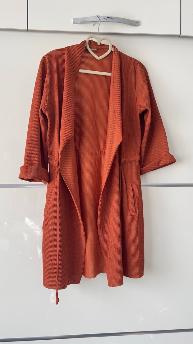 Kadınlar için uzun, rahat kesimli sabahlık. Parlak kahverengi renkte, desensiz, bohem tarzda ve yumuşak dokulu kumaştan üretilmiştir. Cepleri ve belden bağlama özelliği vardır.