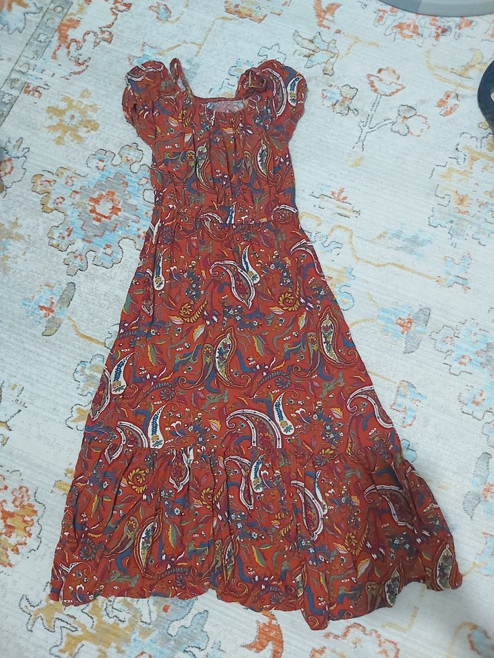 Uzun, renkli ve bol kesim bohem günlük elbise. Tekstil kumaştan, straplez yaka ve fırfır detaylı, batik desenlidir.
