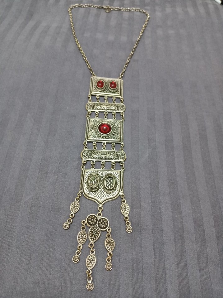 Uzun, renkli bohem tarzda altın renkli zincir detaylı, desenli ve kırmızı taşlı kolye, günlük kullanım için uygundur.