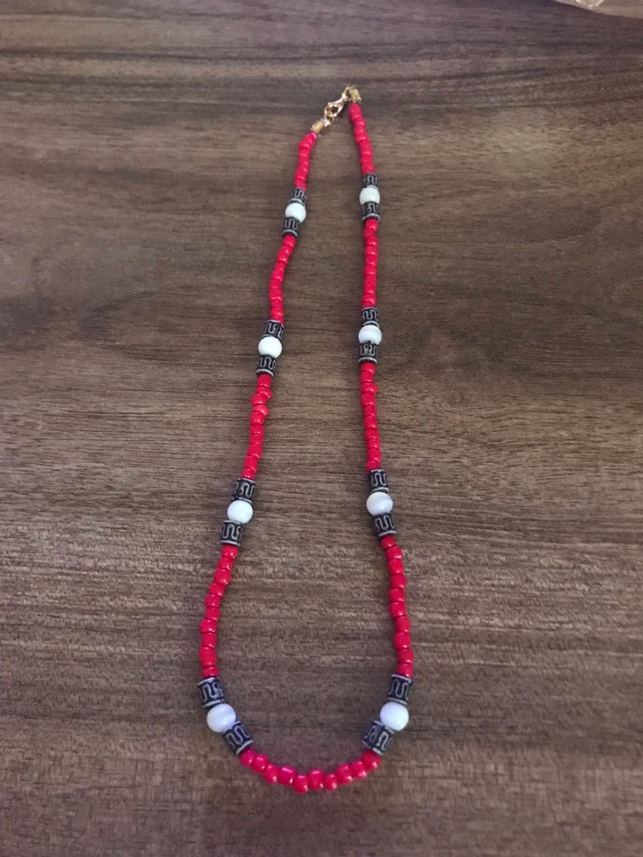 Uzun uzunlukta, renkli kırmızı boncuklar ve beyaz-siyah desenli detaylarla bohem tarzı yansıtan erkek kolyesi. Günlük kullanıma uygundur.