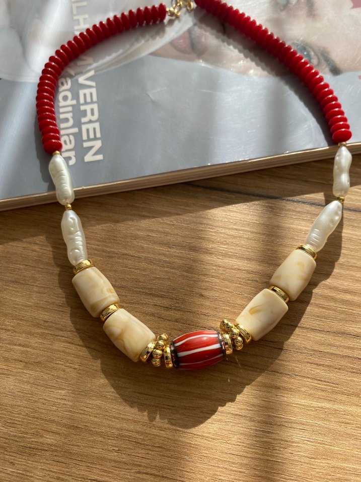 Uzun, renkli kırmızı ve krem boncuklar ile etnik desenli, altın detaylı bohem kadın kolyesi. Günlük kullanıma uygun.