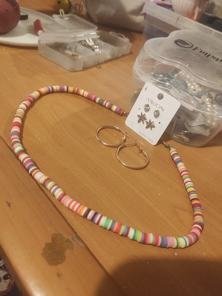 Uzun uzunlukta, pastel tonlarda çok renkli boncuklardan oluşan, bağlama desenli bohem ve retro tarzda kadın kolyesi. gümüş olan küpeleri hiç kullanmadım