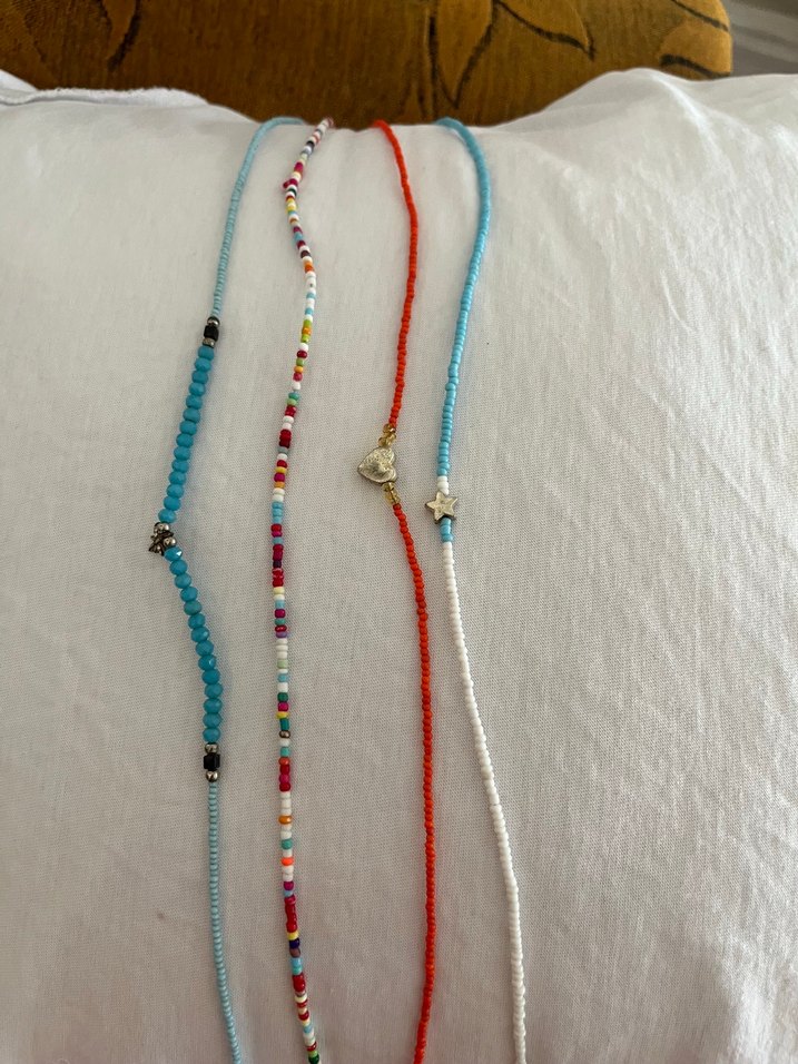 Uzun, renkli boncuklardan oluşan ve işleme desenli, günlük kullanıma uygun bohem tarzda kolye.