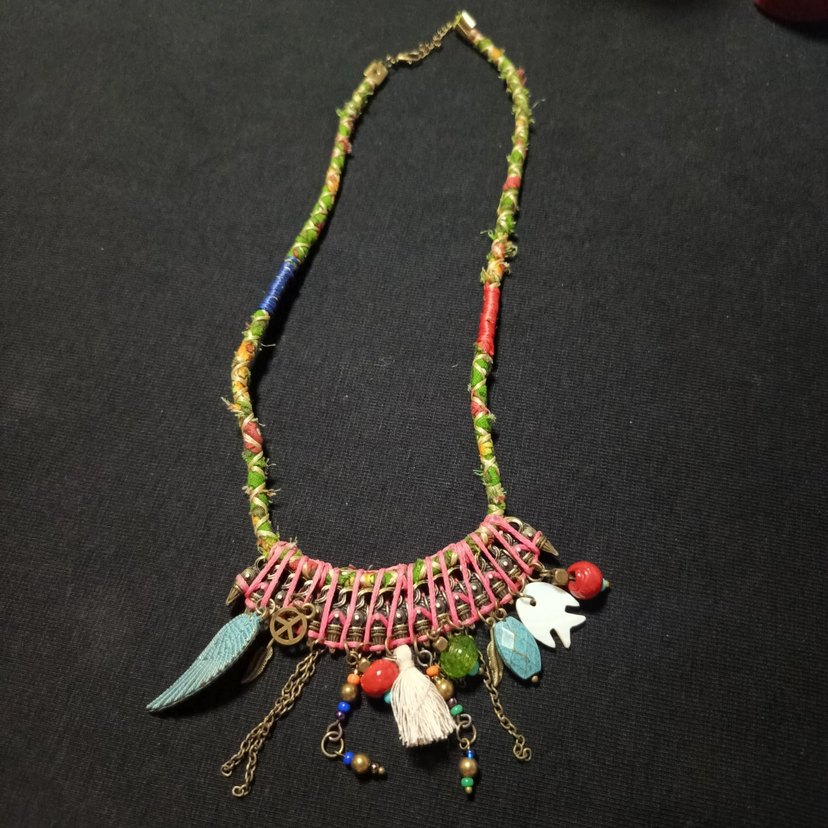 Uzun, renkli boncuklar ve etnik desenlerle süslenmiş bohem kadın kolyesi; kanat, püskül ve zincir gibi çeşitli figürler içerir.