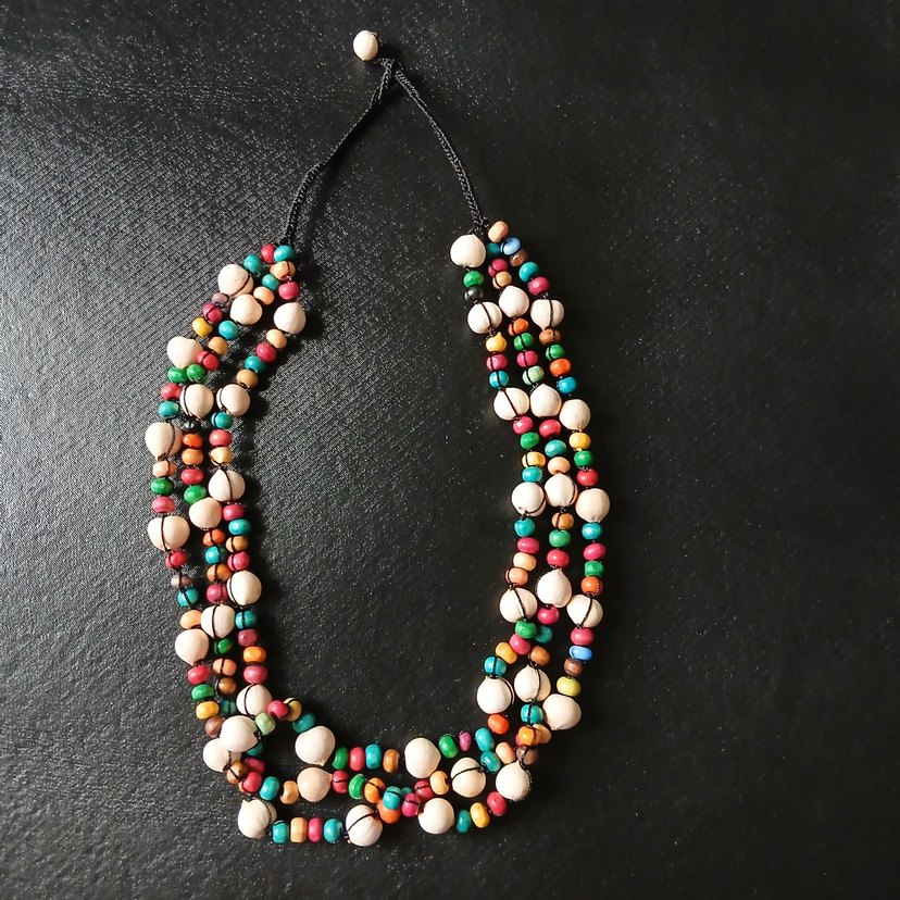 Uzun, renkli boncuklar ve batik desenli bu kolye, bohem ve retro tarzı yansıtır. Canlı renkleriyle günlük kullanıma uygundur.