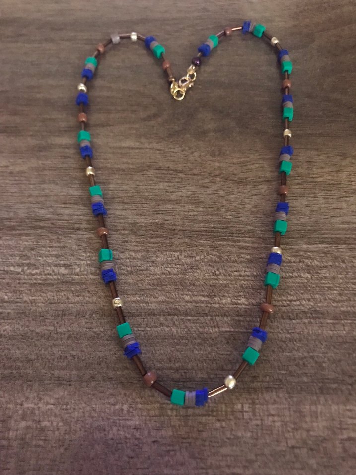 Uzun ve renkli boncuklardan oluşan bu bohem kolye, turkuaz ve mavi tonlarıyla romantik akşamlar için uygun.