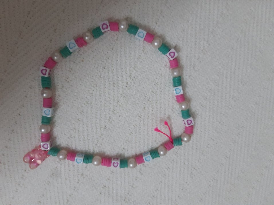 Uzun, pembe, turkuaz ve beyaz pastel renkli kalp desenli boncuklarla tasarlanmış, bohem ve rahat bir kolye.