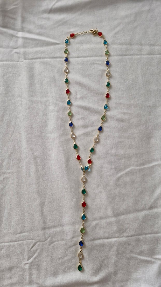 Uzun ve renkli boncuklardan oluşan bohem kolye, günlük kullanım için uygundur.
