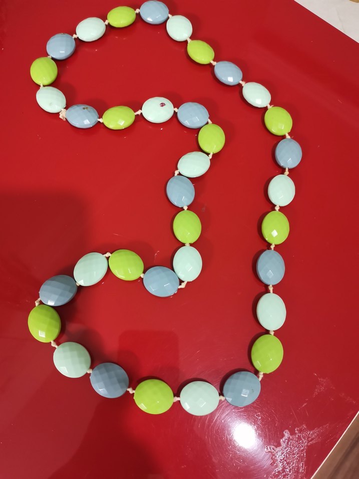 Uzun, yeşil, mavi ve beyaz oval boncuklardan oluşan renkli boncuklu kolye. Bohem tarzıyla parti için uygundur, minimalist dokunuşlar içerir.