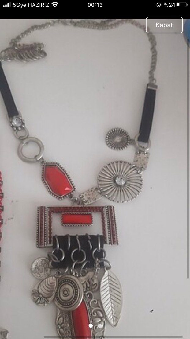 Uzun boyda, renkli kırmızı ve gümüş etnik desenli, zincir detaylı ve çeşitli figürlü bohem kolye. Günlük kullanıma uygundur.