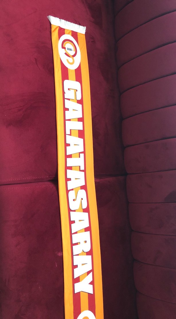 Uzun uzun erkek atkısı, renkli kırmızı ve sarı şeritler ve "GALATASARAY" yazısıyla pop kültür ve athleisure tarzını yansıtıyor.