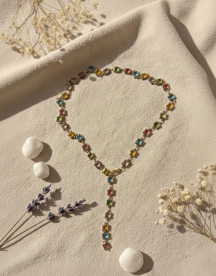 Uzun, çok renkli taşlarla işlenmiş Y şeklinde kolye günlük kullanım için uygun bir tarzda. 50cm