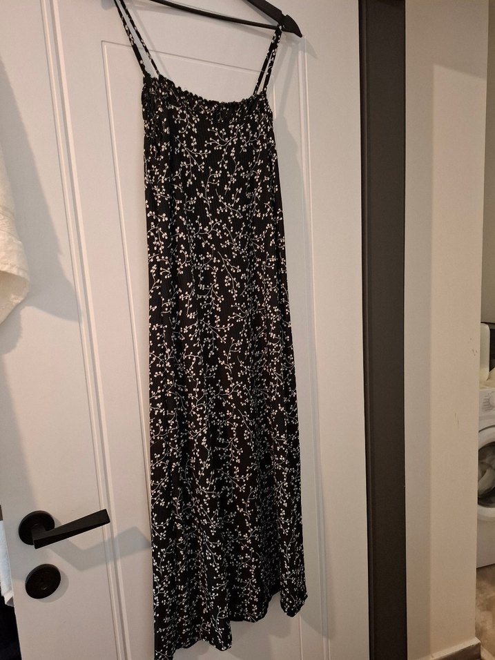 Salaş kesim, uzun siyah elbise ince askılar ve drapeli detaylara sahip. Düz ve hafif batik desen içerir, günlük kullanım için uygundur. Esnek kumaş