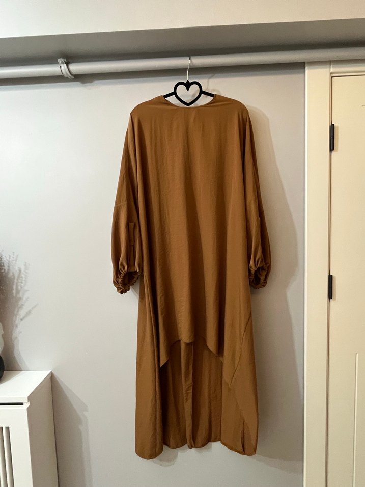 Uzun, salaş kesim bej renkli tunik, dökümlü uzun kollu ve yuvarlak yaka, ipeksi kumaştan minimal bohem tarzında.