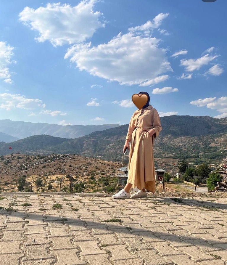 Uzun, salaş kesim camel renkli elbise, yüksek yaka ve uzun kolludur. İpeksi kumaştan, drapeli tasarıma sahiptir, açık hava için uygundur.