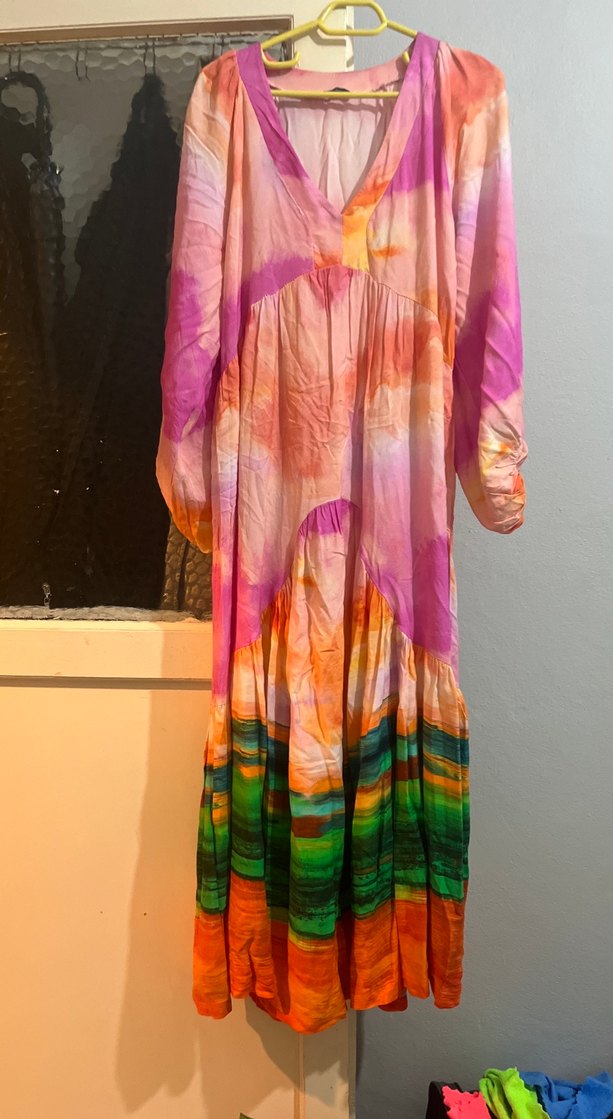 Bu uzun, salaş kesim elbise pastel bağlama desenli ve drapeli detaylara sahip. Uzun kollu, kayık yaka ve ipeksi kumaştan yapılmıştır, bohem tarzda.yeni hiç giyilmedi