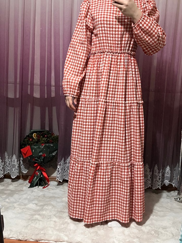uzun kollu, salaş kesim bu uzun elbise yumuşak sentetik kumaştan yapılmıştır ve pastel turuncu ekose desenlidir. Fırfır detaylarıyla günlük sade kullanıma uygundur.