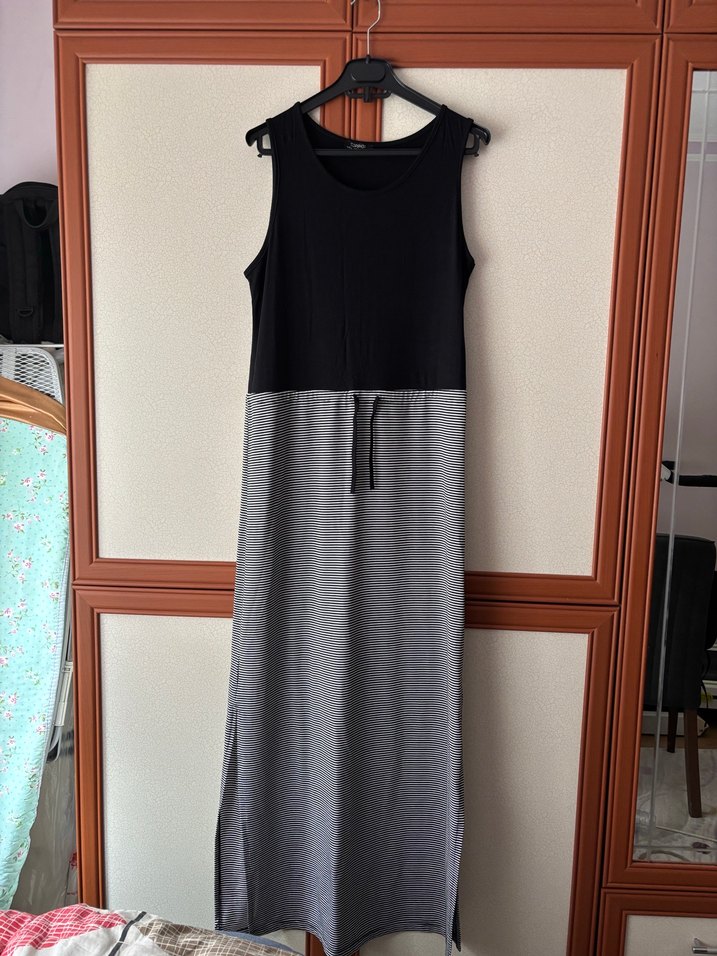 Gri sentetik kumaştan, yuvarlak yakalı ve drapeli, uzun ve salaş kesim kadın elbisesi. Günlük kullanıma uygundur.