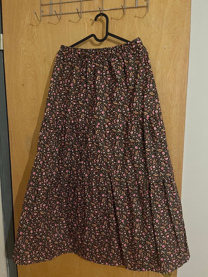 Uzun, salaş kesimli bohem etek, dökümlü tasarıma sahiptir. Koyu kahverengi zemin üzerinde küçük çiçek deseni vardır, günlük kullanım için uygundur. Ceylan otantik’ten alındı, 1 kere bile giyilmedi. 2 beden (40-42) ancak beli ve ilk katı bana biraz sıkı oldu.