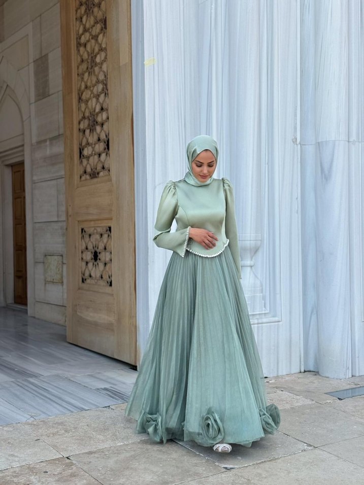 Bu haki renk uzun abiye elbise, salaş kesim ve drapeli detaylara sahip, uzun kollu ve yüksek yakalı, düğünler için mütevazı ve göz alıcı bir stil sunar. Satılık 16 bin