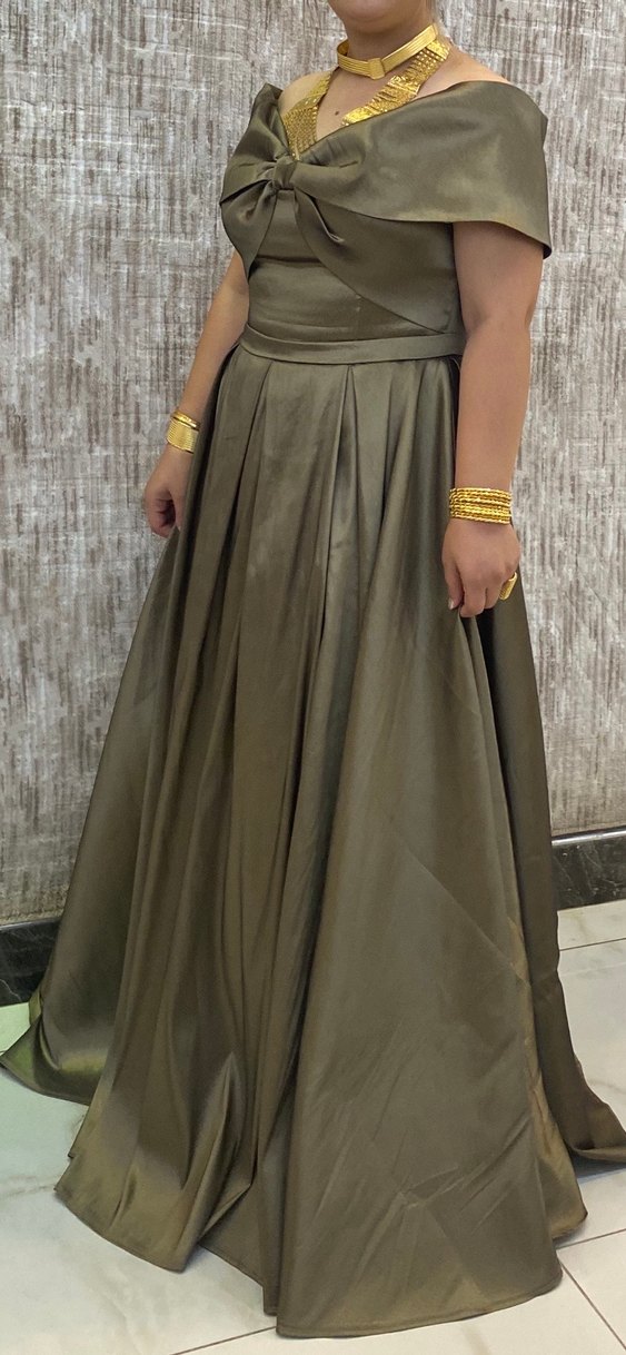 Uzun, salaş kesim kadın abiye, kayık yaka ve parlak haki renkte drapeli tasarıma sahiptir. Kolsuz ve desensizdir, klasik şıklıkta düğünler için uygundur.